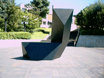 ![]() 県立美術館所蔵 無断転載厳禁 この彫刻プロムナードで最も目立つ作品。 しかし、これが実は簪(かんざし)である事を知っている者はどのくらいいるだろうか? これは美術館が開く直前にクレーンで空から降りて来たらしく、その最初から人々を驚かせた。 作者は簪がつきささっている盛り土を盛り上がらせる事によって、「フォルムと土をなじませた」のだと言う。う〜む、インスパイアリー! Q4 この作品の全長は? A 70cm B 約2m22cm22mm22... C 約5M Q3の答え B 子供たちが平和そうに、その四角柱にもたれたり、丸い石にまたがったりしていてほしいらしい。